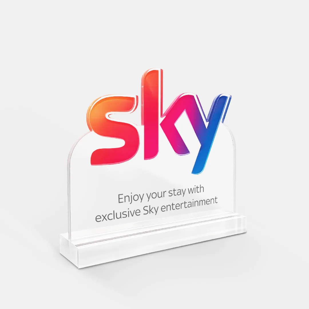 Espositore da banco utile per comunicare in modo chiaro la presenza di Sky e orientare gli ospiti nella fruizione dei contenuti disponibili si adatta a reception, lounge e spazi di attesa.
